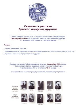 The Serbian Chemical Society is a non-governmental and non-profit association, the ninth of its kind ever established in the world. It was founded at Marko Lek’s suggestion on 27 November 1897 (15 November according to the Old Calendar).