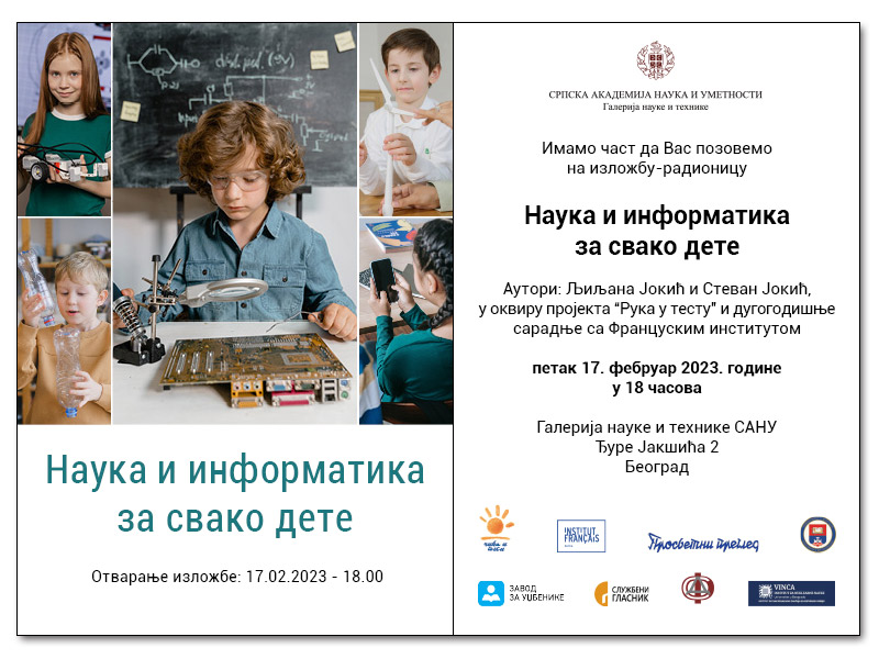 An exhibition titled ’Science and Information Technology Education for Each Child’, authored by Stevan Jokić and Ljiljana Jokić, opens at the SASA Gallery of Science and Technology, on Friday, 17 February, at 6 p.m.