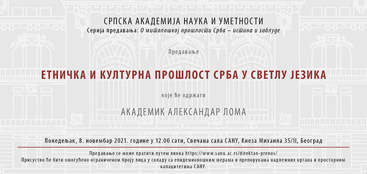 У оквиру циклуса предавања под називом „О митолошкој прошлости Срба: истина и заблуде”, у понедељак, 8. новембра, у 12 сати, у Свечаној сали САНУ, академик Александар Лома одржаће предавање под називом „Етничка и културна прошлост Срба у светлу језика”.