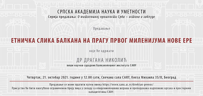У оквиру циклуса предавања под називом „О митолошкој прошлости Срба: истина и заблуде”, у четвртак, 21. октобра, у 12 сати, у Свечаној сали САНУ, др Драгана Николић, виши научни сарадник на Балканолошком институту САНУ, одржаће предавање под називом „Етничка слика Балкана на прагу првог миленијума нове ере”.
