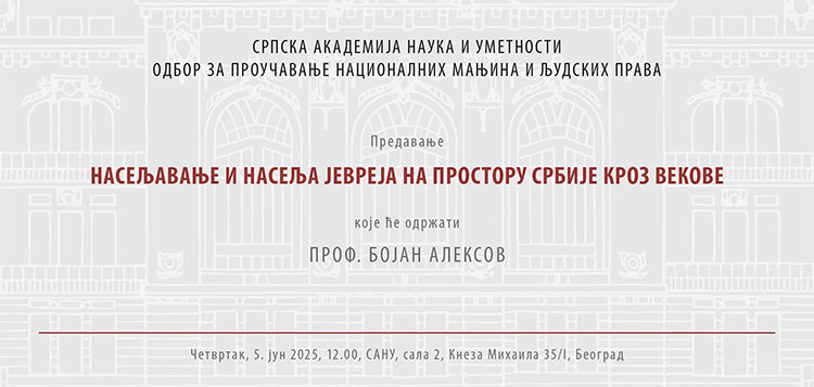 Проф. Бојан Алексов одржаће предавање под називом „Насељавања и насеља Јевреја на простору Србије кроз векове”, у четвртак, 5. Јуна, у 12 сати, у Сали 2 САНУ.
