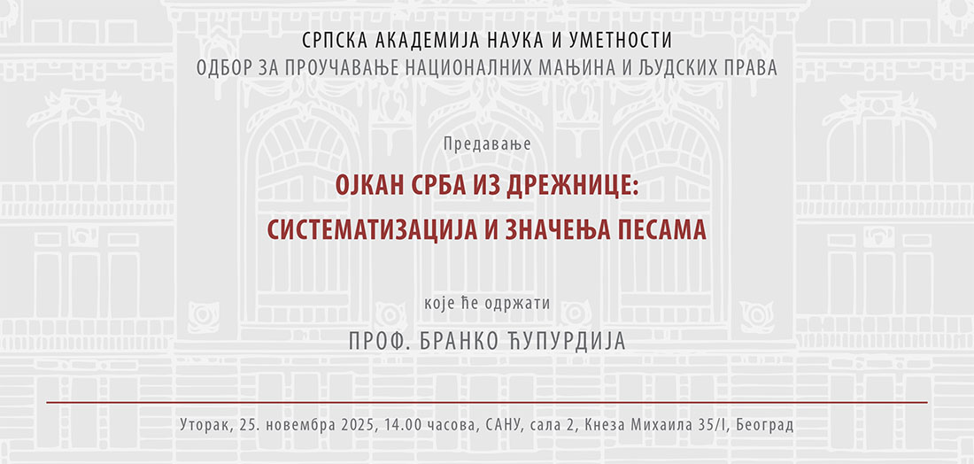 Проф. Бранко Ћупурдија одржаће предавање под називом „Ојкан Срба из Дрежнице: систематизација и значења песама” у уторак, 25. новембра, у 14 сати, у Сали 2 САНУ.