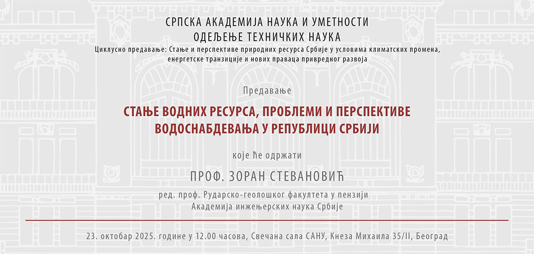 У оквиру циклуса „Стање и перспективе природних ресурса Србије у условима климатских промена, енергетске транзиције и нових праваца привредног развоја“, у четвртак, 23. октобра, у 12 сати, у Свечаној сали САНУ, др Зоран Стевановић, пензионисани редовни професор Рударско-геолошког факултета Универзитета у Београду, одржаће предавање под називом „Стање водених ресурса, проблеми и перспективе водоснабдевања у Републици Србији“.