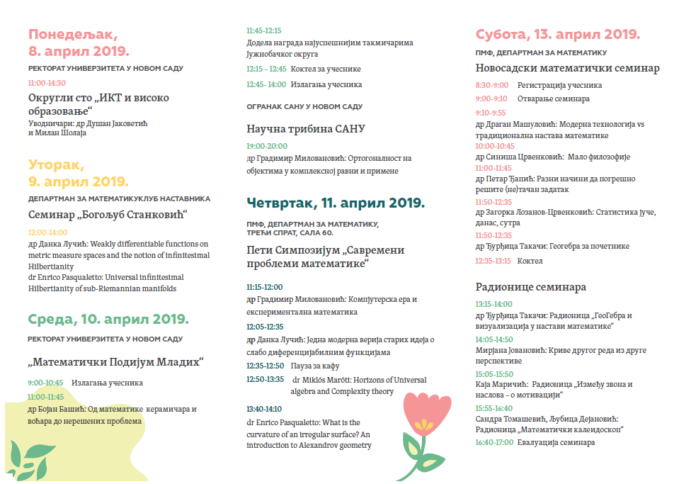 Програм, између осталог, обухвата округли сто на тему „Информационо-комуникационе технологије и високо образовање”, највећу конференцију за талентоване средњошколце Србије „Математички подијум младих“, затим симпозијум о савременим проблемима математике, целодневни математички семинар с радионицама, као и научну трибину САНУ на којој ће 10. априла у 19 сати говорити наш чувени математичар академик Градимир Миловановић.