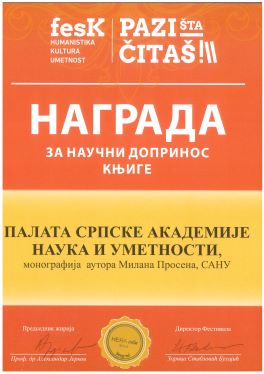 На осмом Фестивалу хуманистике, културе и уметности – ФесК „Пази шта читаш“, одржаном у децембру 2025. године, у ПТТ музеју у Београду, монографија Палата Српске академије наука и уметности аутора проф. Милана Просена, овенчана је Наградом за научни допринос књиге.